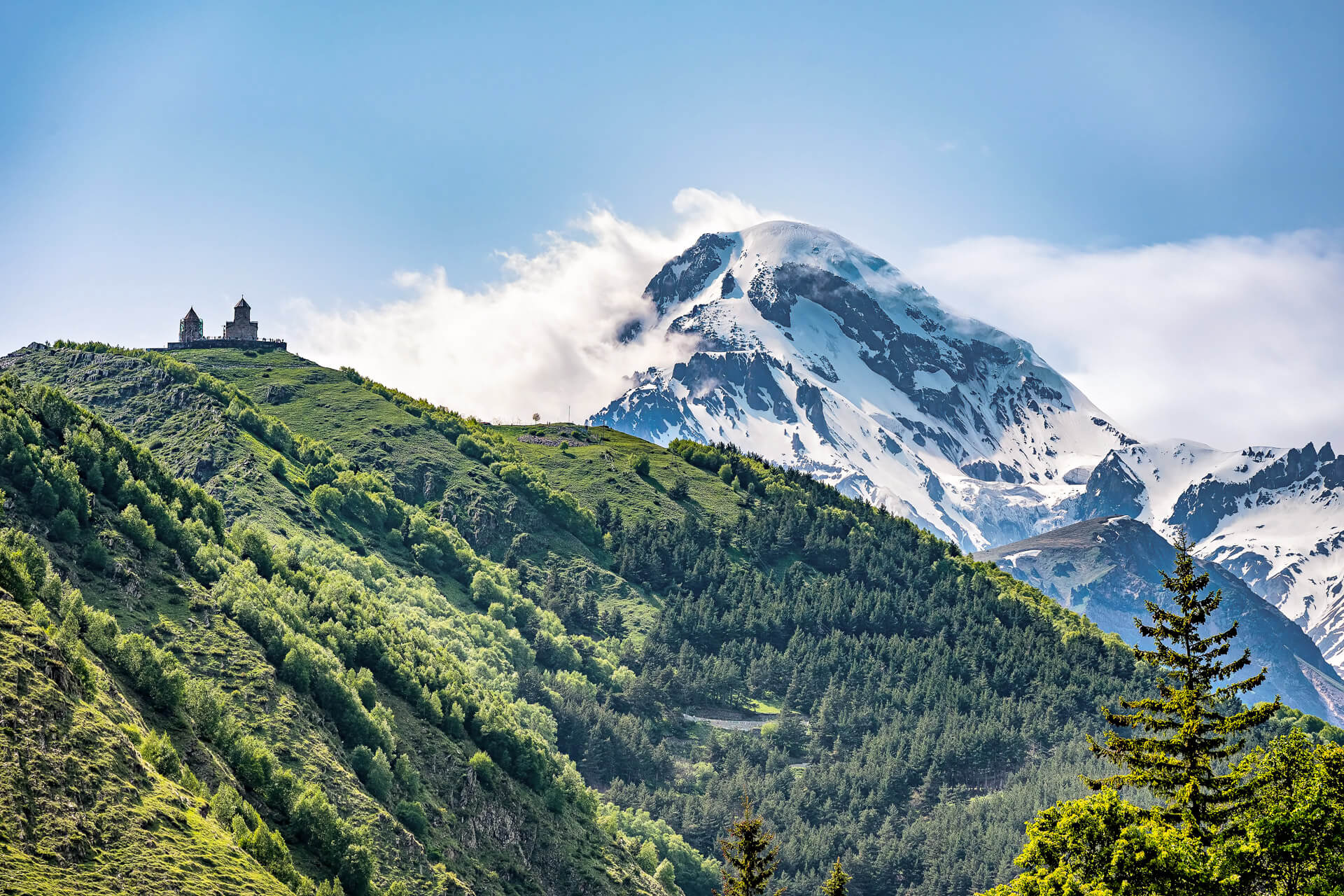 - Stepantsminda, Gergetier Dreifaltigkeitskirche, Großer Kaukasus